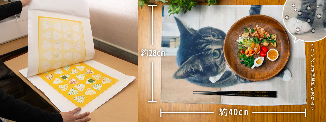 インクジェット工場にて、お好みの写真やイラストをプリントして世界で1枚だけのオリジナル撥水ランチョンマットを作成いただけます!